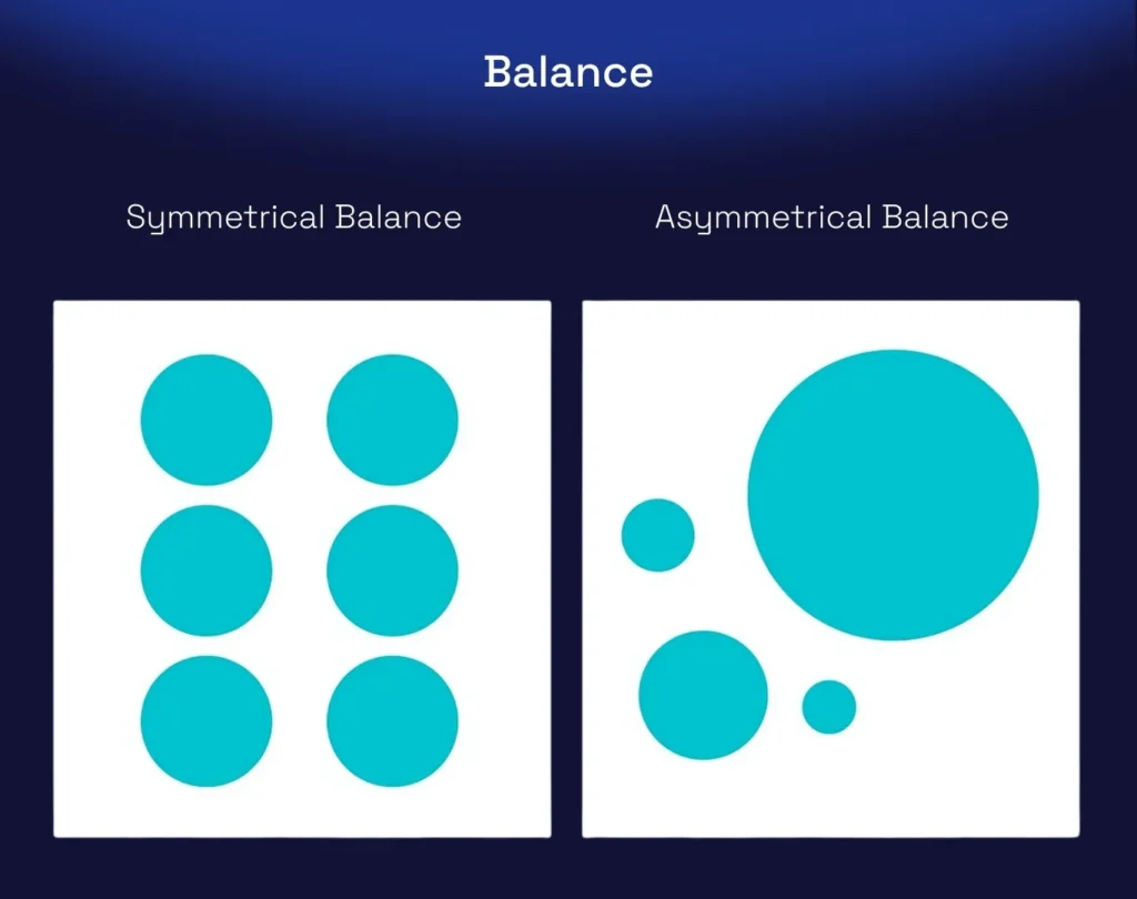 ভারসাম্য হলো ডিজাইনে সব উপাদানকে সুষমভাবে সাজানো, যাতে কোনো অংশ অতিরিক্ত ভারী বা ফাঁকা না লাগে। এটি ভিজ্যুয়াল স্থিতি আনে।